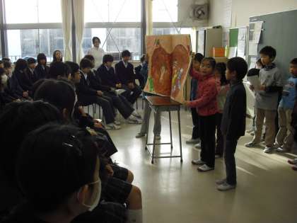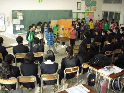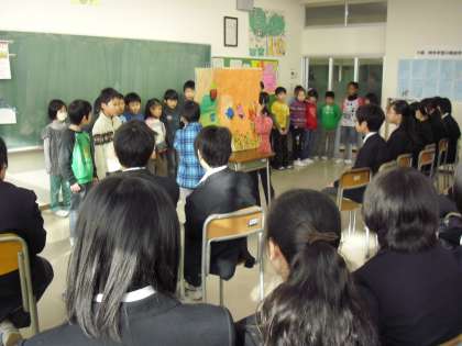 中学生は温かな眼差しで、2年生の読み聞かせを聴いてくれています。2年生も安心したのか、いつの間にかのびのびとした声で自分の台詞を発表しています。やさしい雰囲気が子どもたちを包み込んでいます。