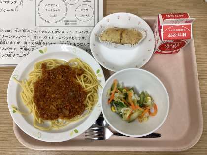 今日は、スパゲティーミートソース、アスパラガスのサラダ、紅茶のカップケーキ、牛乳です。