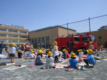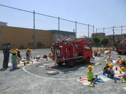 1年生みんなで校庭に出て、学校にやってきた消防車2台の周りに集まり、大きな画用紙に消防車を描きました。