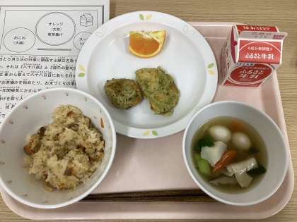 今日は、中華おこわ、煎茶揚げ、ワンタンスープ、清見オレンジ、牛乳です。