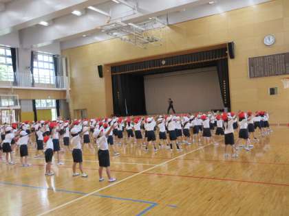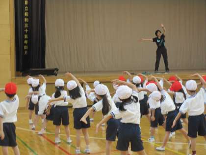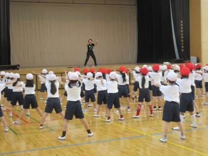 今日の3・4時間目は、1年生が運動会の表現の練習をしました。先生の動きを見本にしながら、1年生のみんなは元気よく踊っていました。音楽にも合わせて動くことができるようになってきて、どんどん上手になっています。本番が楽しみです。