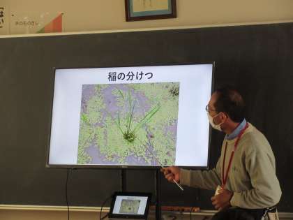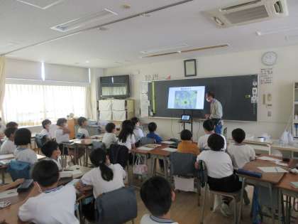 今日は5年生が総合的な学習の時間に行っている「稲作物語」の第1回目が各クラスで行われました。今年度も稲作の指導に田中さんをゲストティーチャーでお招きして学習します。今日は「稲の分けつ」や「おしべとめしべの特徴」などについて詳しく学習しました。5年生は真剣な表情で話を聞き、ワークシートに記録していました。