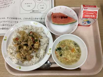 今日は、ガパオライス、コーンと卵のスープ、小玉すいか、牛乳です。