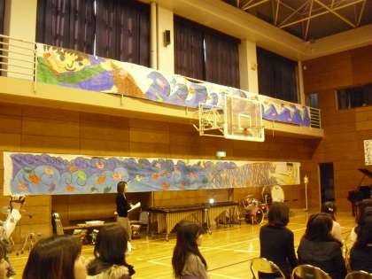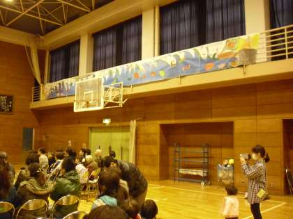 会場には、運動会の際に作成した「ソーラン節」の大漁旗を飾りました。会場には、「ソーラン節」を見に来てくださった芦花ホームの方々も駆けつけてくださいました。