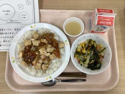 今日は、四川豆腐丼、海藻サラダ、りんごゼリー、牛乳です。