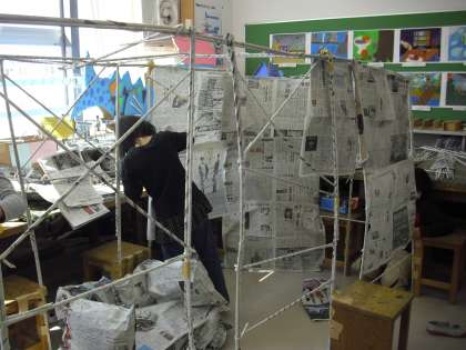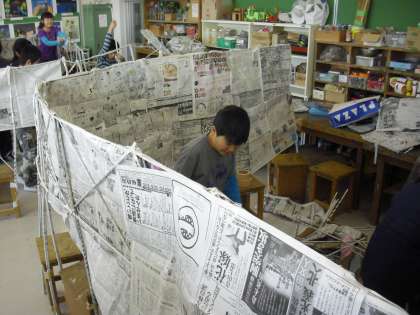 4年生の図画工作の授業の様子です。今日は新聞紙の隠れ家づくりの本番です。準備してきた新聞紙の材料を使って隠れ家づくりです。今日は一日隠れ家で過ごします。友達と協力しながら、自分たちだけの隠れ家を作っていきます。見ている方もワクワクします。