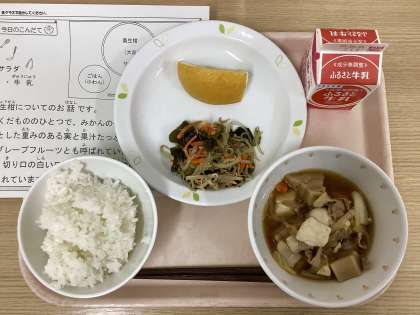 今日は、ごはん、すき焼き煮、カリじゃこサラダ、美生柑、牛乳です。