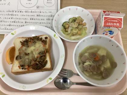 きんぴらトースト、ポトフ、ビーンズサラダ、バレンシアオレンジ、牛乳です。
