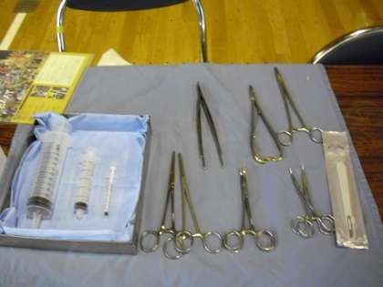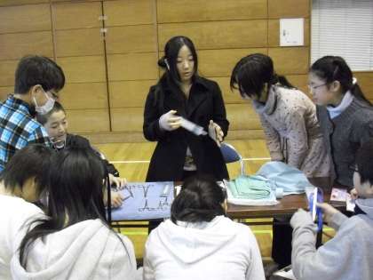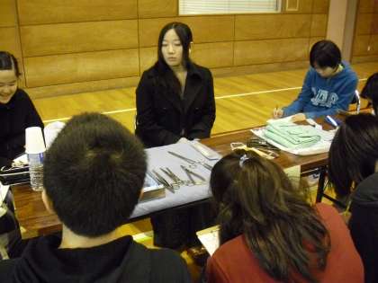 看護師さんです。診察や手術で扱う器具を子どもたちに見せたり、実際に手に持たせてくれたりしながら話をしてくれました。具体的にどのような場面で使うのかなどをくわしく話してくれました。