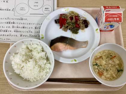 今日は、ごはん、魚の塩焼き、なすとピーマンの肉味噌炒め、むらくも汁、牛乳です。