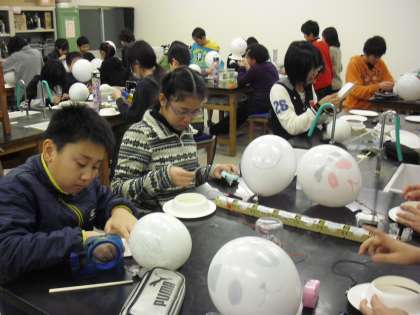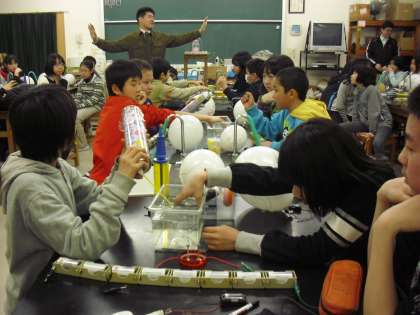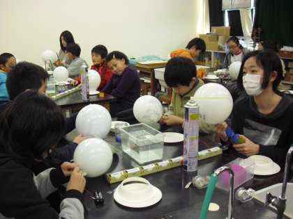 6年生の科学教室の授業の様子です。中学校の理科講師が教えてくれます。場所も中学校の理科室です。電気の仕組みを使った学習です。豆電球そのままの光と、ふくらませた風船の中に入れた豆電球の光の違いを確かめます。どのような違いがあり、それはなぜかを科学します。