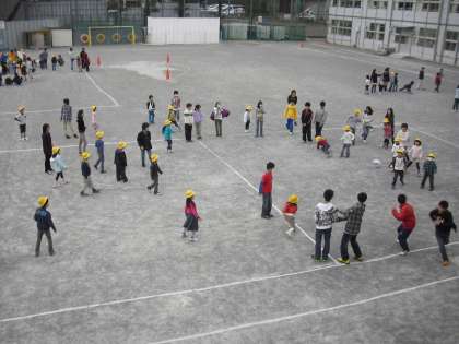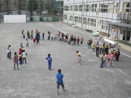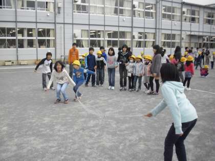 今朝のフレンドワールドの様子です。校庭で遊んでいるのは、1年生と6年生です。ドッジボールをしたり、長なわ跳びをしたりしています。長なわ跳びでは、6年生と1年生がいっしょにてをつないで跳んでいました。ほほえましい光景です。