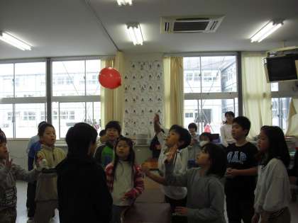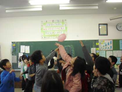 3年生と4年生は室内遊びです。風船バレーボールをして楽しんでいます。風船の打ち方でコースが変わる風船の動きが楽しいようで、とても盛り上がっていました。4月からは学年が一つ上がり、交流の学年もお互いに変わります。
