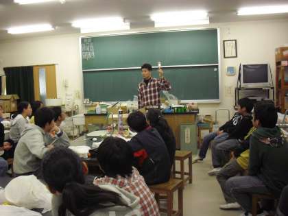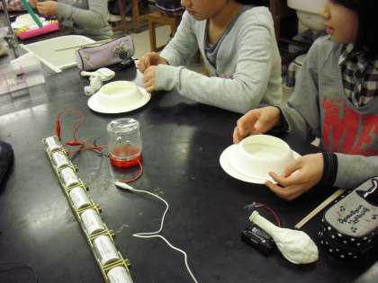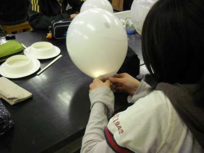 6年生の科学教室の授業の様子です。今日も中学校の理科講師の先生が子どもたちに科学の楽しさを教えてくれました。紙皿を加工して台を作り、その上に豆電球を入れた膨らませた風船をおきます。