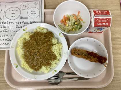 今日は、ターメリックライス、レンズ豆入りキーマカレー、白身魚のフライ、コールスローサラダ、牛乳です。今日は図書室とのコラボ給食です。「キツネのホイティ」という絵本に出てくる料理を再現しました。