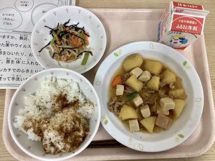 今日は、ごはん、おかかふりかけ、肉じゃがうま煮、野菜ののリ酢あえ、牛乳です。