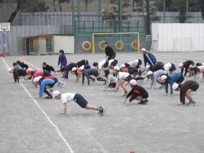 5年生が取り組んでいる自主参加の体力アップ朝練の様子です。担任の合図に合わせて体を反射的に動かす運動に取り組んでいます。敏捷性を養う運動です。その後は、校庭を走ります。週に1回ですが、続けてきたことで子どもたちの動きも軽やかです。