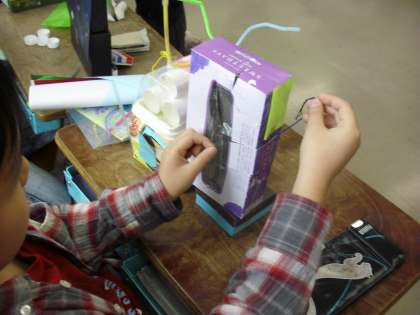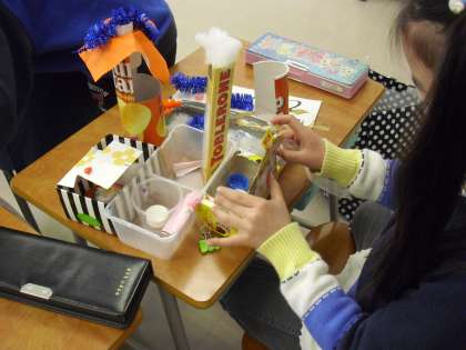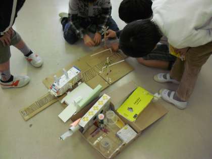 1年生の図画工作の授業の様子です。「ゆめのまちさんちょうめ」の学習で工作に取り組んでいるところです。空き箱やカップなど、いろいろな材料を使って家を作っています。友達同士で作ったものを組み合わせ「ゆめのまち」を楽しんでいます。