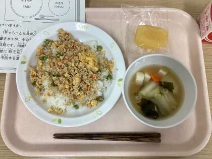 今日は、四色そぼろ丼、冬瓜のみそ汁、冷凍りんご、牛乳です。今日は夏至なので、冬瓜を使った給食です。