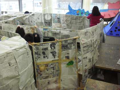 4年生の図画工作の授業の様子です。子どもたちが楽しみにしていた「新聞紙の隠れ家づくり」です。まず新聞紙を丸めた柱を組み立て、壁代わりの新聞紙を貼っていきます。屋根を工夫したり、ドアや窓を工夫したり、子どもたちの発想が生かされます。