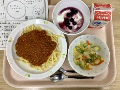 今日は、スパゲティーミートソース、アスパラガスのサラダ、東京都産ブルーベリーを使ったヨーグルト、牛乳です。