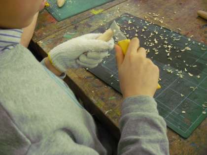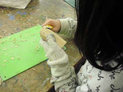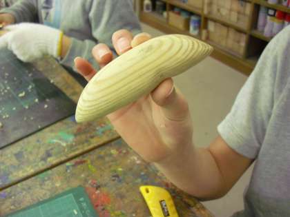 5年生の図画工作の授業の様子です。6年生も取り組んだ木工作「削って磨いていい形」の学習です。木材をナイフで削りながら、最終的には丸みのあるつるつるの手ざわりのよい形を目指します。少しずつ角度を出しながら削ります。紙やすりも並行して使います。同じ大きさや形のものはありません。自分だけの「いい形」です。