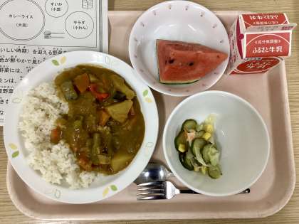 今日は、夏野菜カレーライス、コーンサラダ、小玉すいか、牛乳です。