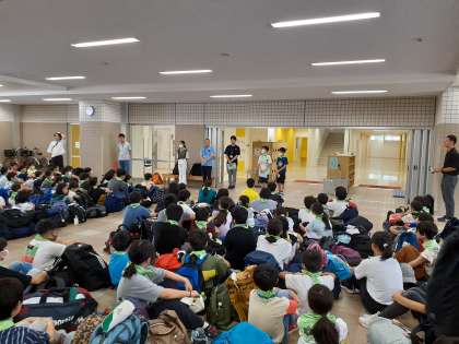 いよいよ、日光林間学園に出発します。7月21日の朝、ピロティで出発式を行いました。
