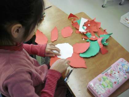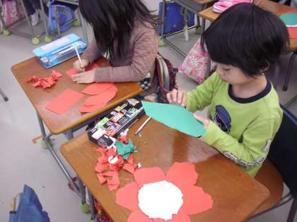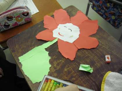 1年生の図画工作の授業の様子です。新1年生をお迎えする装飾を作っているところです。ハサミを使わず手でちぎって花を作っています。手づくりで温かな感じがします。最後はクレヨンでお花に笑顔を描きました。