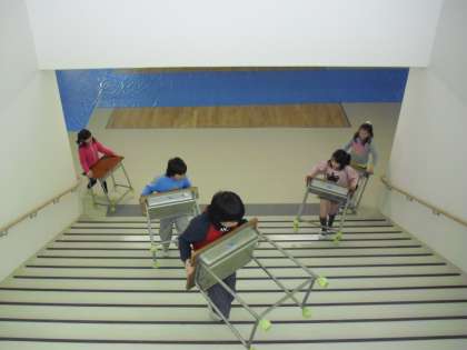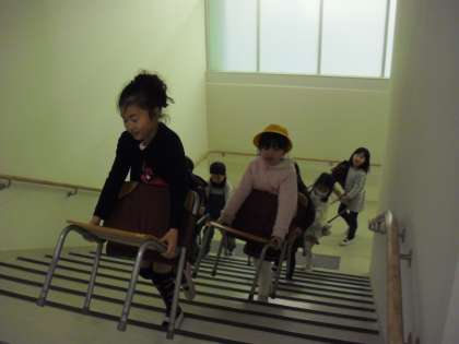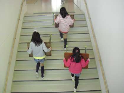 4階が4・5年生、3階が2・3年生、2階が1・6年生です。子どもたちは初めて入る校舎を見上げながら、教室を目指します。子どもたちの声が新校舎に響きます。新しい校舎での生活がいよいよ始まります。