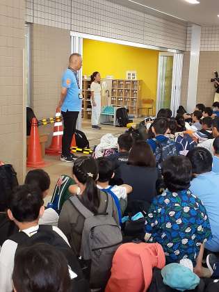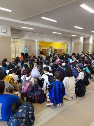 出発式では、今回の移動教室スローガン 「協力、切りかえ、思い出」を確認しました。元気に行ってきます!