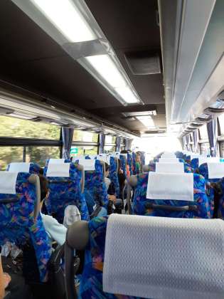 高速道路に入り、バスレクをしながら三芳PAに到着しました。トイレ休憩を済ませ、またバスを走らせています。