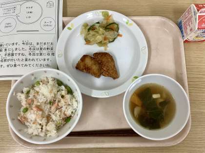 今日は、鮭と枝豆のごはん、いかのかりんと揚げ、中華サラダ、冬瓜スープ、牛乳です。