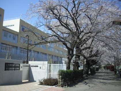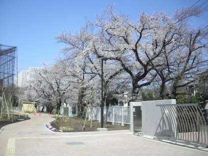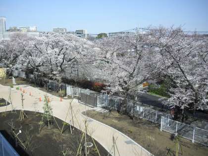 北門前の遊歩道沿いの桜並木の様子です。温かな日差しの中、満開の桜に新校舎が映えます。校舎から見下ろす桜も美しい風景です。