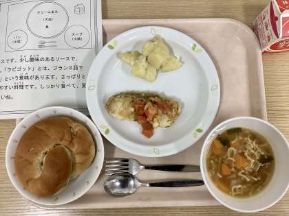 今日は、ぶどうパン、白身魚のラビゴットソース、ABCトマトスープ、じゃがいものクリームあえ、牛乳です。
