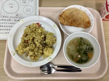 今日は、メキシカンピラフ、揚げタコス、野菜スープ、牛乳です。