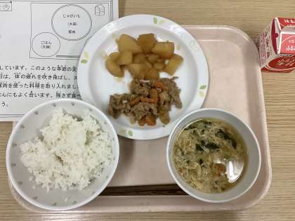 今日は、ごはん、豚肉のごまみそ炒め、じゃがいもの甘辛煮、かきたま汁、牛乳です。