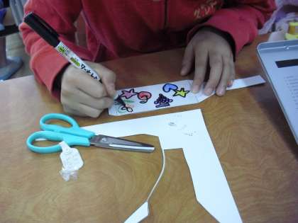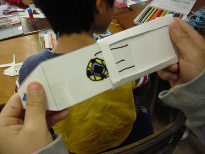 3年生の図画工作の授業の様子です。工作「マジックカード」を作っているところです。カードに自分の好きな絵を描き、ひと工夫すると・・・白黒の絵のカードを抜くとカラーになりました。その秘密はお子さんに聞いてみてください。