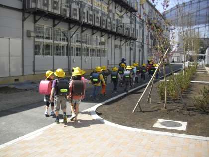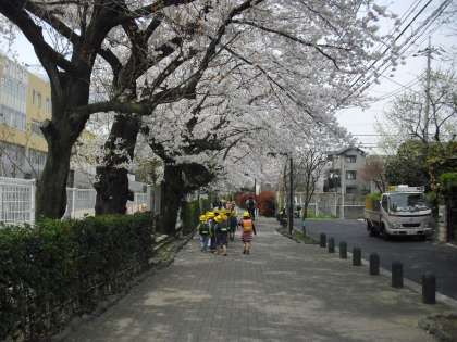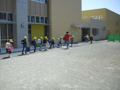 1年生の集団下校の様子です。帰る方面別に7つの班に分かれて下校します。学童クラブも1つの班です。友達ともすっかりなかよしになりました。みんなで下校しながら道を覚えることはもちろん、安全な道路の歩き方や危険な箇所を学びます。