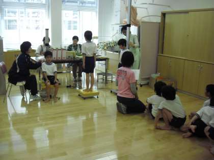 定期健康診断の様子です。1年生が発育測定を行っています。測定を受ける前に、養護教諭から正しい測定の受け方を教えてもらいました。1年生は順番を守りながら、身長、体重、座高を計測しました。