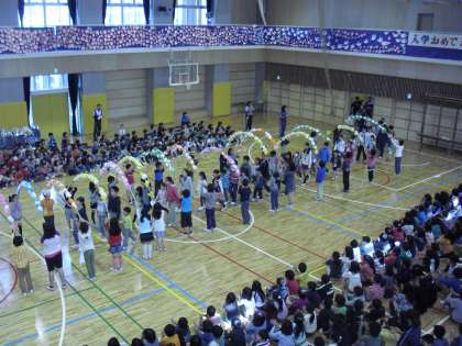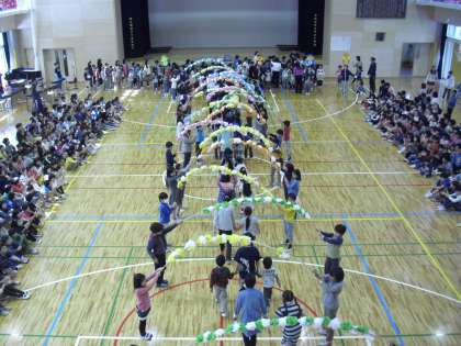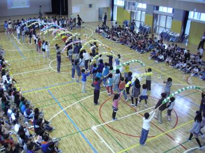 1時間目に行った「1年生を迎える会」の様子です。4年生が持つ花のアーチを、6年生といっしょにくぐっての入場です。子どもたちは大きな拍手で1年生を迎えました。6年生と手をつないだ1年生はうれしそうです。
