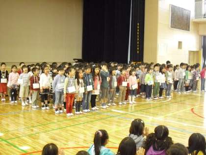 1年生のあいさつです。わくわくするような毎日、入学してからのことを呼びかけ形式で表現しました。新しい校舎、教室、友達、お兄さんお姉さん、楽しい学校生活をミッキーマウスマーチの替え歌にして元気よく歌いました。