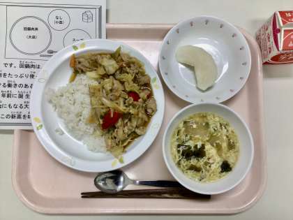 今日は、回鍋肉丼、冬瓜と卵のスープ、梨(新高)、牛乳です。
