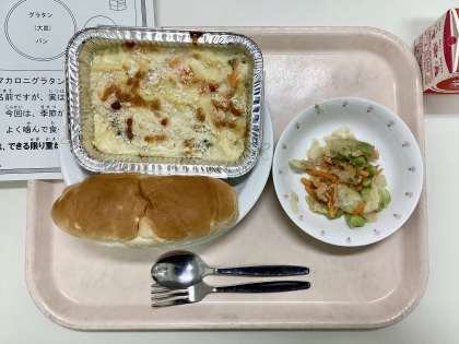 今日は、パインパン、マカロニグラタン、ツナと枝豆のサラダ、牛乳です。
