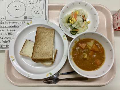 今日は、二色サンド、ハンガリアンシチュー、コーンサラダ、牛乳です。