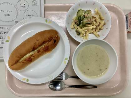 今日は、焼きカレードック、コーンポタージュ、ツナとマカロニのサラダ、牛乳です。