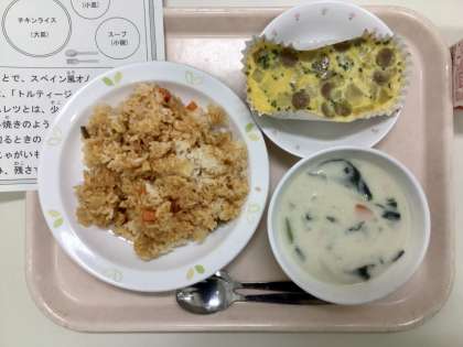 今日は、チキンライス、スペイン風オムレツ、小松菜のクリームスープ、牛乳です。