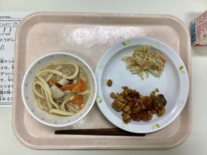今日は、みそ煮込みうどん、魚と大豆のかりんとうがらめ、野菜のごま酢かけ、牛乳です。