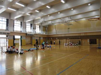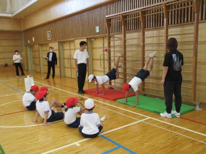 いろいろな転がり方や、歩き方、川とびの仕方を理解して運動に取り組むことができることを本時の目標としました。4つのステージをグループごとに分かれながらどの子も頑張っていました。