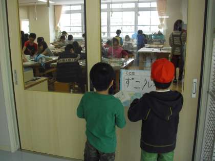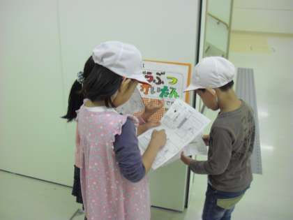 1・2年生の生活科の授業の様子です。校舎の地図を手に2年生が1年生を連れて校内の様々な場所を見つけ、シールをはっていくスタンプラリー形式で行いました。1年生が楽しめるようにと、2年生も張り切っていました。手をつないでの移動が、なんとも微笑ましいです。